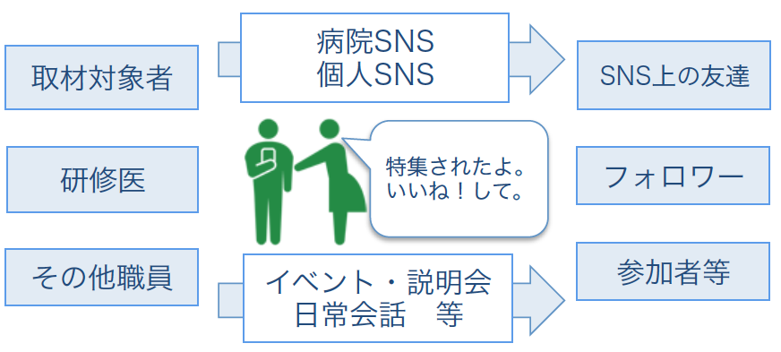 取材対象者や院内職員、イベント等の参加者にもご協力いただき、SNSを活用して友達に紹介する。